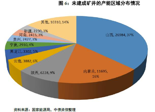 而从存量产能来看,目前全国范围内存在较多未批先建的在建矿井,根据中国煤炭资源网的统计,截至2016年年末,全国未核准产能合计6亿吨,其中已建成的产能2.8亿吨,停建产能3.2亿吨,其中有70%以上均为500万吨以上的大型现代化矿井。