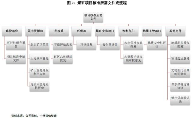办理煤矿项目核准是在取得“路条”的前提下,向国家发改委提交近20项支持性文件。其中,可行性研究报告的主要任务是确定矿井开发的必要性和可行性,一般由建设单位委托有资质的设计单位编写,并经有资质的咨询机构评估、通过;需国土资源部审批的文件至少有4项,包括划定矿区范围、土地预审意见、地质灾害危险性评价、矿山资源开发利用方案等,实际操作中,国土资源部一般委托项目所在地的省级国土资源主管部门受理;环境影响评价批复需要环保部审批;安全预评价需国家安监总局审批。整体来看,项目审核涉及的文件复杂,审批机构多,办理难度大,所需时间长。一般而言,从路条发放到核准,短则两年,长则3年~5年。