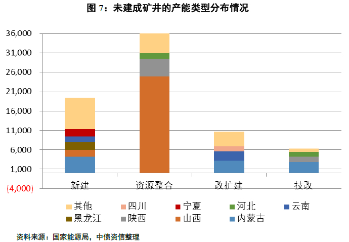 截至2017年6月末,已核准的资源整合矿井3.60亿吨,为在建矿井中产能最大的矿井类型。资源整合矿井主要分布在山西、陕西等地区,分别占比69.2%、12.7%,合计占比81.9%。山西煤炭资源开始于2009年,整合主体为山西省七大煤企集团,2012年3月,山西煤炭资源整合结束,全省矿井个数由整合之前的2598处减少到1053处,办矿主体由2200多家减少到130多家。