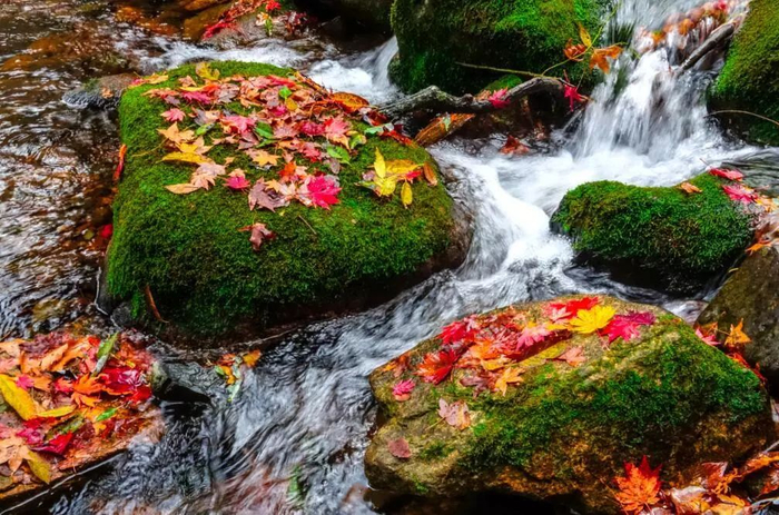 枫林谷几乎包含了红与黄的所有色系,从朱红、大红、深红、褐红等,到柠檬黄、深黄、藤黄……如同暖阳流霞。
