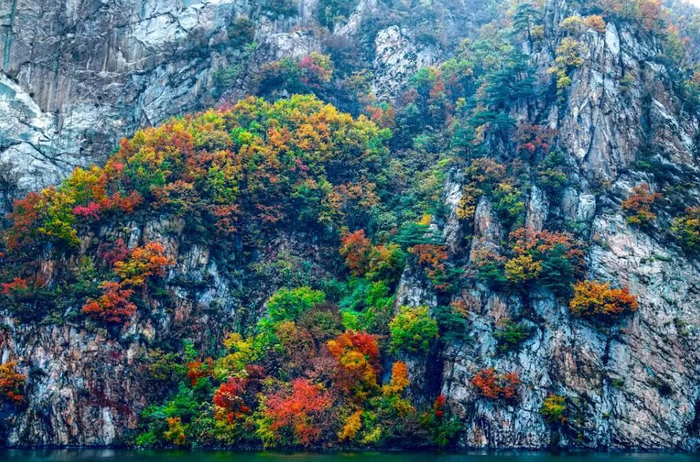 廻龙湖上赏两岸峭壁上的色彩斑斓。