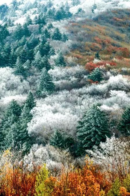 还要说说“八面威”的雾凇。八面威是山脉的主峰,它最先告别秋季,山顶丛树结满霜质的雾凇,宛若冰肌玉骨。季节正在转向冷冽的冬天刻度——冬云遥在天外,肃穆凛然。