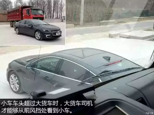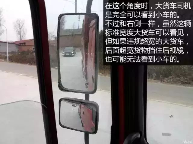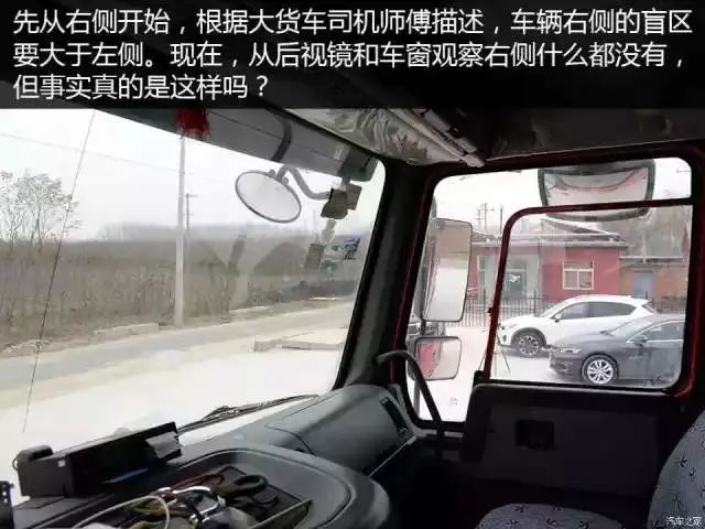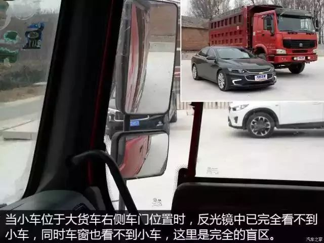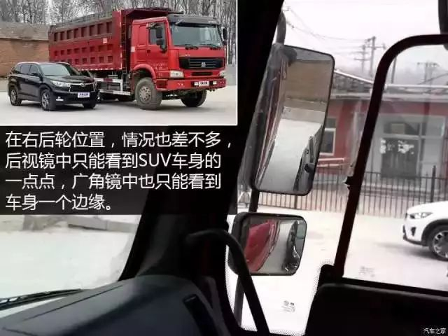 从实际实验来看不管是身材较小的轿车,还是身材稍大的SUV车型,在大货车司机的眼里其实都是差不多的,也就是说我们大多数私家车,不管你是奥拓还是奥迪Q7,只要你在大货车的盲区中,大货车司机都是看不见的。而总体来说,大货车左侧的情况要好于右侧,尤其是在右前轮的位置,是绝对的视觉盲区,另外左右两侧的后轮位置也比较危险。