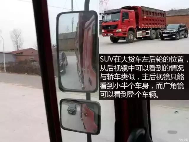 从上面的几张图中我们可以看到,车身比较矮的轿车在大货车四周时,尤其是在右侧时,大货车非常不容易被发现,左侧稍好一些。那么换成车身比较高的SUV车型会怎么样呢?