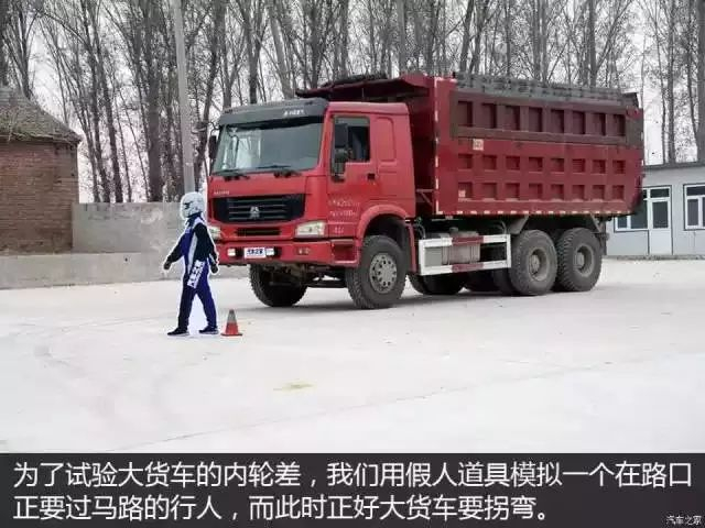 从实验中可以看到,大货车的内轮差面积还是比较大的,而这只是车身较短的自卸车,如果换成车身较长的半挂车,那么内轮差面积会更大。其实很多类似的事故就是因为行人、非机动车不了解汽车的内轮差问题,在过马路时离拐弯的大货车距离太近,进入了大货车内轮差的区域而造成的,在此我也想提醒大家,当在路口准备过马路时,一定要注意左右两边是否有准备转弯的大货车,看到它们必须远离,因为有时大货车司机是看不到两侧行人或非机动车的,而行人没有躲避意识的话,就很可能发生事故。