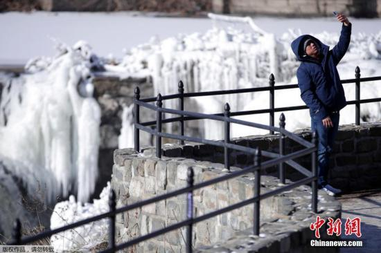美国国家气象局气象学家布赖恩·赫尔利说,随后全美可能20多个地方会刷新低温纪录。图为当地时间1月2日,新泽西州东北部城市帕特森的居民Obdulio Arenas举起手机自拍,在他身后是在极寒天气中冻住的瀑布。