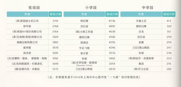 国内作家中,杨红樱最受小学段儿童欢迎。2016年,杨红樱作品借阅总次数达到8736次。其中最受小学生欢迎的作品有《笑猫日记》系列、《寻找大熊猫》《天真妈妈》等,均进入了单本前100名。
