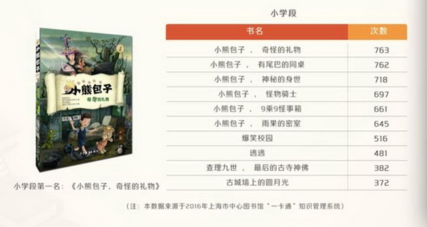 在单本作品排名中,由六位上海的儿童文学作家共同创作的《小熊包子》系列非常热门,包揽了榜单前6名。