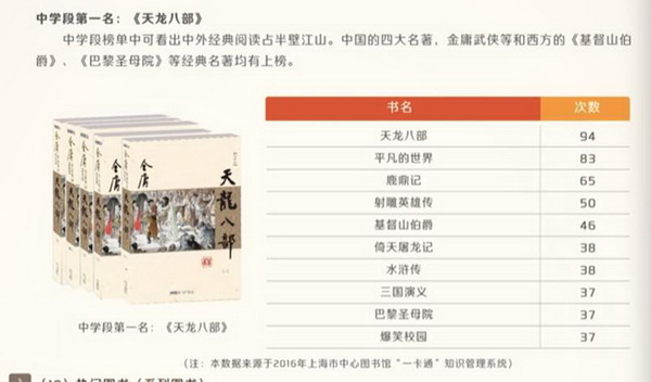 《上海市少年儿童阅读报告》发布:中学生最爱看《天龙八部》