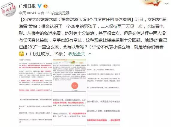 【28岁大龄姑娘求助:相亲对象认识3个月没有任何身体接触】近日,女网友“深海雪”发帖:相亲认识了一个29岁的男孩子,二人保持两三天见一次,吃饭看电影。从楼主的叙述来看,她对象十分满意,甚至很喜欢。但是交往过程中两人没有任何身体接触,牵手也没有牵过,这种现象让楼主感到十分困惑。她担心“自己已经28了”一直这么淡,会有以后吗?(评论不代表小编立场,就是给你们看看)(钱江晚报、19楼)