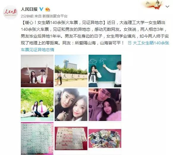 【暖心!女生晒140余张火车票,见证异地恋】近日,大连理工大学一女生晒出140余张火车票,见证和男友的异地恋,感动无数网友。女孩说,两人相恋3年,男友毕业后异地1年半。男友不在身边的日子,女生用学业填充,如今两人终于实现了地理上的零距离。网友:所爱隔山海,山海皆可平!