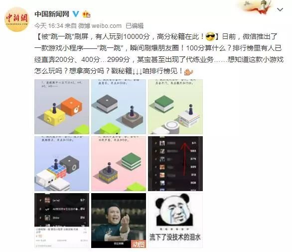 【被"跳一跳"刷屏,有人玩到10000分,高分秘籍在此!】日前,微信推出了一款游戏小程序——"跳一跳",瞬间刷爆朋友圈!100分算什么?排行榜里有人已经直奔200分、400分…2999分,某宝甚至出现了代练业务……想知道这款小游戏怎么玩吗?想拿高分吗?戳秘籍↓↓↓咱排行榜见!