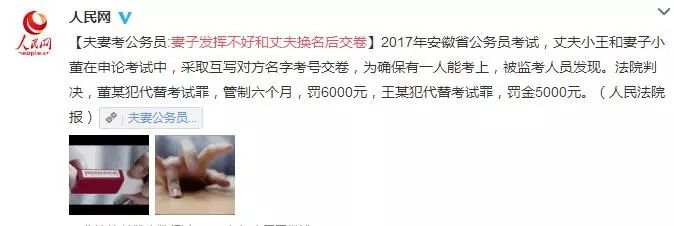 【夫妻考公务员:妻子发挥不好和丈夫换名后交卷】2017年安徽省公务员考试,丈夫小王和妻子小董在申论考试中,采取互写对方名字考号交卷,为确保有一人能考上,被监考人员发现。法院判决,董某犯代替考试罪,管制六个月,罚6000元,王某犯代替考试罪,罚金5000元。(人民法院报)