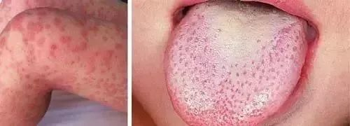 1.起病急,表现为高热(体温较高),咽痛,全身鸡皮疙瘩样红色丘疹,脸色潮红,口唇周围苍白。