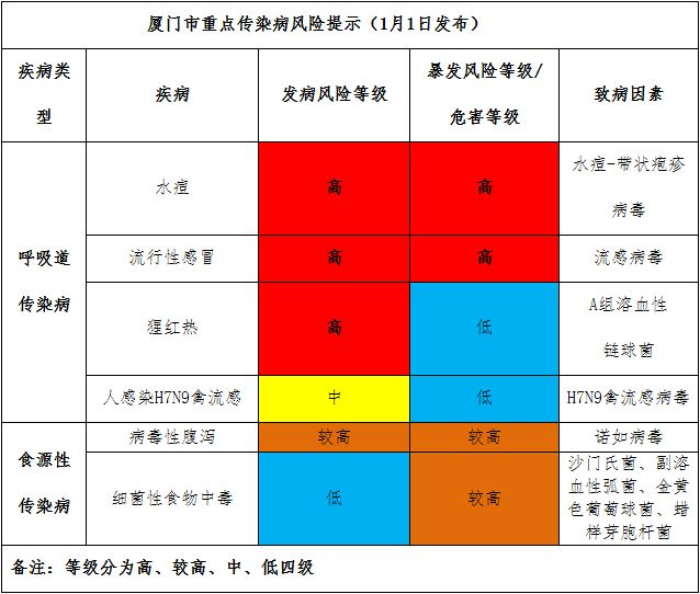 “厦门疾控中心1月1日:根据厦门传染病和突发公共卫生事件监测数据,结合国际国内传染病疫情动态,经过专家会商评估,预计未来一段时期——厦门本地需特别关注的传染病为:水痘、流行性感冒、猩红热、人感染H7N9禽流感;重点预防食源性疾病为:病毒性腹泻、细菌性食物中毒;重点预防伤害:机动车车祸、低温烫伤和冬季运动伤。