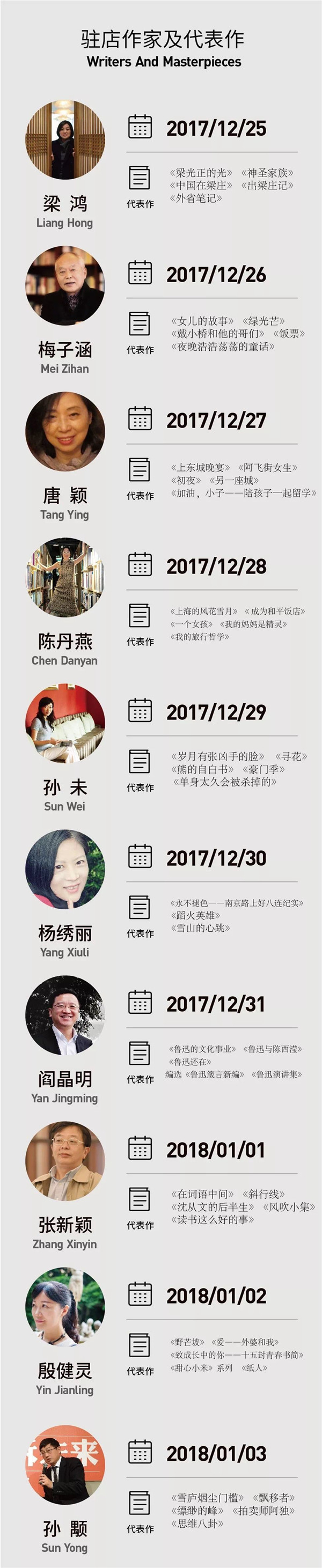 2018年1月3日傍晚,“思南书局·概念店”即将完美落幕,闭幕式将于1月3日17:30在思南小广场举行,特别邀请来自SMG的六位主持人为大家朗读60位驻店作家们为书局留下的寄语。上海市黄浦区委书记杲云和当日驻店作家孙颙共同关上思南书局的大门,启动熄灯仪式。