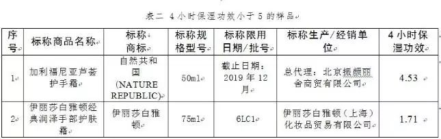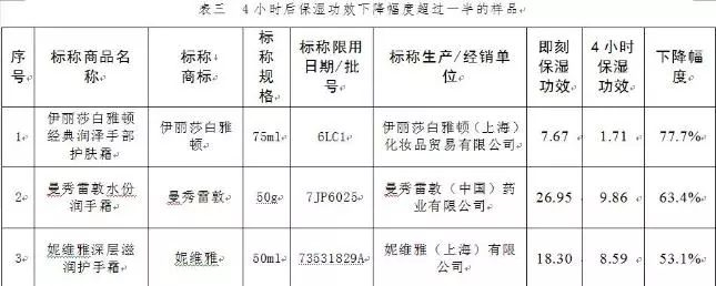 检测结果发现, 以4小时保湿功效为例,27件样品最高的为25.22,最低的仅为1.71。4小时保湿效果功效小于5的两款样品都是洋品牌。自然共和国(nature republic)的标称为“加利福尼亚芦荟护手霜”的商品4小时保湿功效仅为4.53;伊丽莎白雅顿的“伊丽莎白雅顿经典润泽手部护肤霜”的4小时保湿功效仅为1.71!