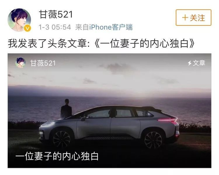 1月3日凌晨5:54,深陷舆论漩涡的贾跃亭妻子甘薇发表了标题为《一位妻子的内心独白》的头条文章,表示“对乐视体系公司债务危机引发的影响,给社会、政府、投资人、股民、供应商、员工都带来了巨大负面影响和损失,我代老贾向大家致以诚挚的歉意。”
