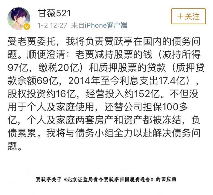 也是在1月2日12:27,甘薇发微博称,将负责贾跃亭在国内的债务问题。将与债务小组全力以赴解决债务问题。