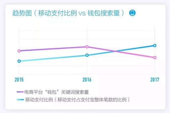 移动支付目前已经普及到全年龄层,而现金的使用越来越少。有一个有趣的统计,阿里数据显示过去3年里电商平台箱包类产品的搜索量稳步上升,但“钱包”的搜索量却出现明显下降,看来不用现金,大家也不买钱包了。