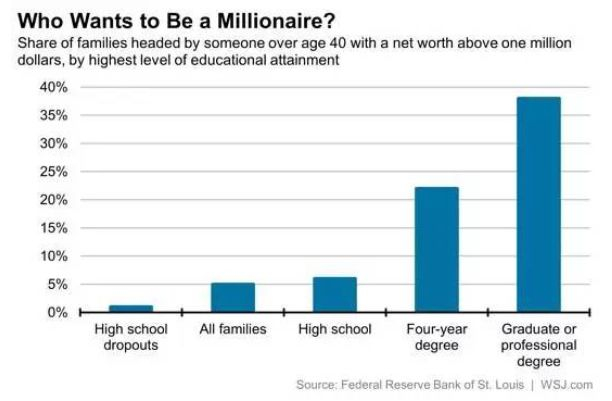 硕士学历以上家庭比高中学历家庭的百万富翁比例高30倍。