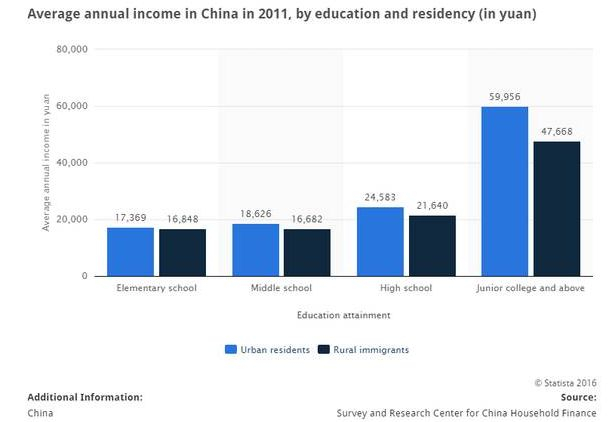 仅看此统计数据,也可以明显感受到中国不同受教育阶层之间的收入鸿沟。阿Q们再愿意自欺欺人,他们也不得不面对这样的事实:知识改变命运这一真理仍然成立。