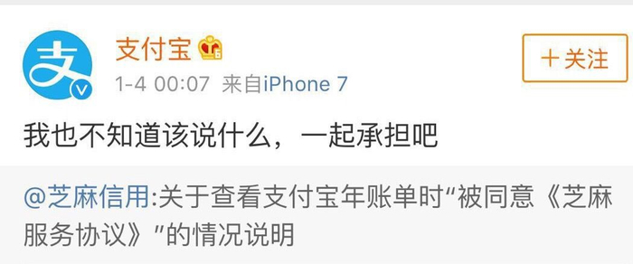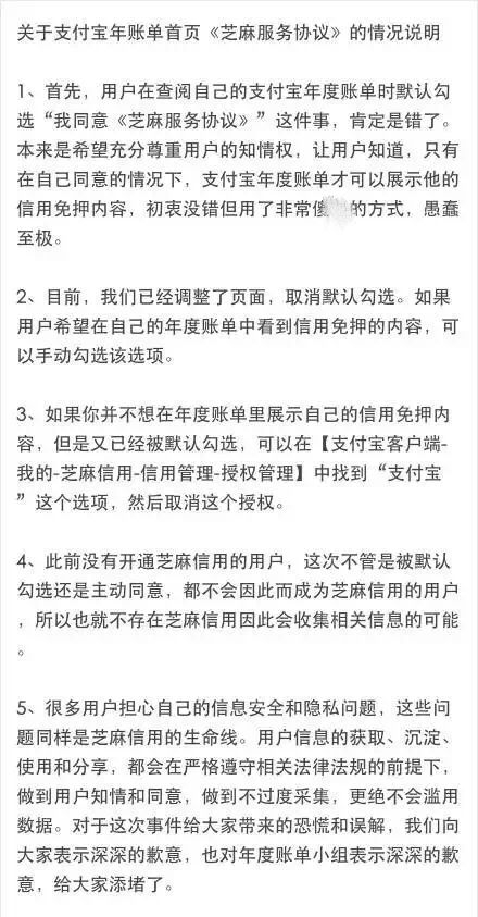 支付宝今天(4日)零时7分在官方微博上回复,称用户在查阅自己的支付宝年度账单时默认勾选“我同意《芝麻服务协议》”这件事,肯定是错了,认为“初衷没错但用了非常傻的方式,愚蠢至极”,目前该问题已修复,另外默认“选择同意”可以取消,以下为情况说明。