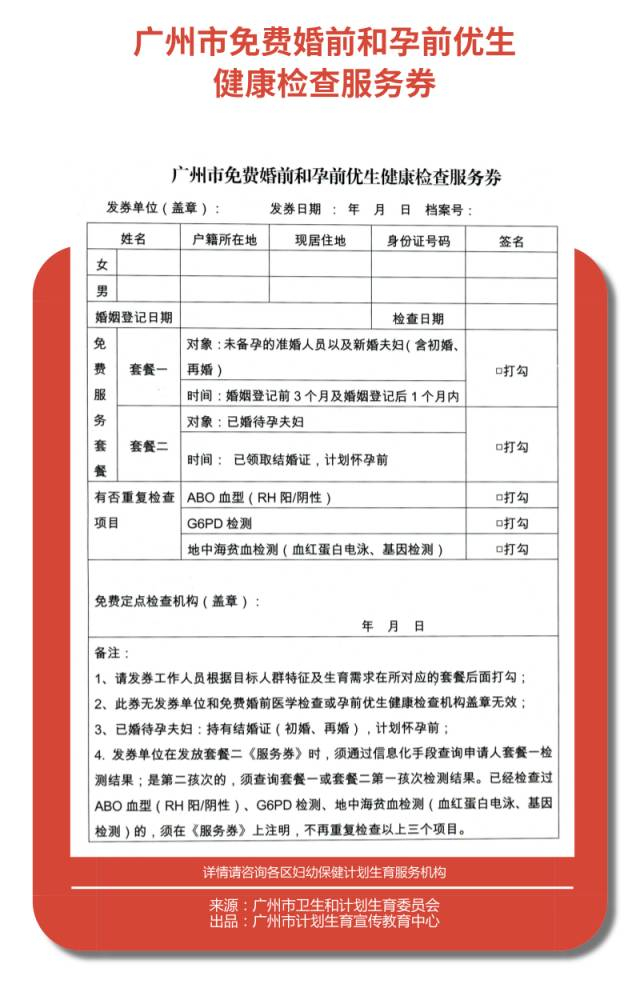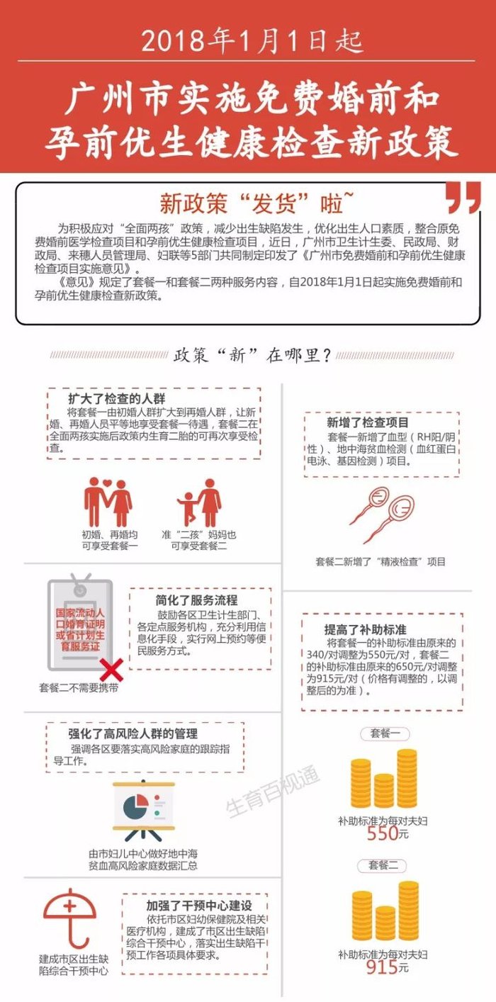 为积极应对全面两孩政策减少出生缺陷发生,优化出生人口素质,广州市自2018年1月1日起实施免费婚检和孕前优生健康检查新政策,市民可享受价值550元和915元的免费检查。