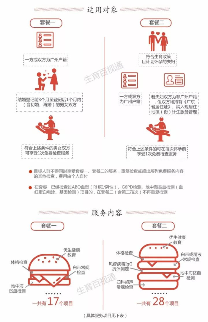据悉,此次推出的婚检、孕检新政分为两种套餐。夫妻一方或双方为广州户籍,结婚登记前3个月至登记后1个月内(含初婚、再婚)的男女双方,方可享受1次免费检查服务。