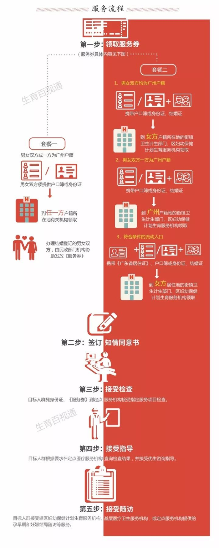 按照统一安排,计划享受套餐二免费孕前检查服务符合条件的流动人口须提供《广东省居住证》、户口簿或身份证、结婚证到女方居住地的街镇卫生计生部门、区妇幼保健计划生育服务机构领取《服务券》。