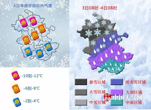 6 日早晨最低气温:淮河以北和本省山区达-12℃~-10℃;江淮之间-8℃~-6℃;其他地区-4℃~-2℃。