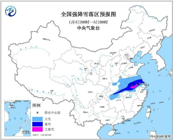 今天降雪中心向东向南移动,湖北、安徽、江苏等地雪势猛烈。为此,中央气象台继续发布暴雪橙色预警,预计,4日08时至5日08时,河南中南部、湖北中东部、湖南西北部、安徽大部、江苏大部等地有大到暴雪,其中,安徽中部、江苏西南部等地局地有大暴雪(20~30毫米)。上述地区新增积雪深度5~10厘米,局地可达15~20厘米。