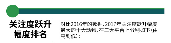 对比2016年的数据,2017年关注度跃升幅度最大的十大动物,在三大平台上分别如下(由高到低):