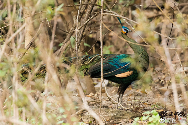 绿孔雀,国家一级保护动物。2017年3月,云南双柏县恐龙河自然保护区中,绿孔雀雄鸟亚成体可见未生长完全的羽屏。 奚志农 图