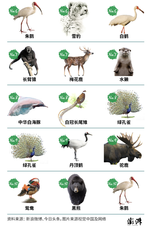 澎湃新闻:大熊猫、穿山甲、天鹅、雪豹、藏羚(羊)、朱鹮、猕猴、长臂猿、黑熊和中华白海豚;