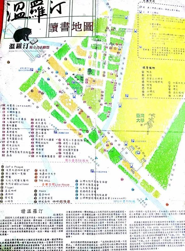 第二份为2010年印行的温罗汀人文地图,这份地图最早一版是2005年出的,这是修订版。这里收录了三四十家独立书店、二十多家咖啡馆,以及各类地下音乐场所,还有一些NGO组织等,总计78个地标。