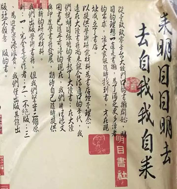 在书店里,看到“来明目目明去,去自我我自来”这样一幅字,这应该是“明目”店名的由来。赖先生说,叔叔已经过世了,现在台北这家店由他打理,他们在老家台中还有一家明目书社。后来跟台湾书店观察家李志铭聊天,他说他也喜欢来明目和赖老板坐着聊天。