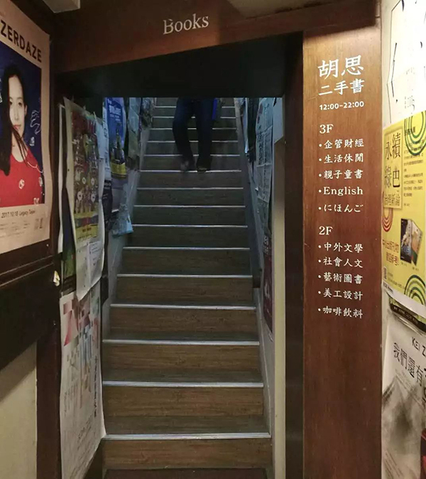 胡思二手书店,从一个小小门洞进去,上楼,楼道两边贴满了各种艺文活动海报,书店在二、三楼,二楼以台湾文史、艺术书为主,还有一些特价50-100元的文学书,三楼以英文原版和童书为主。胡思由几位女文艺青年创办,比较注重店内清新的设计以及咖啡区域,咖啡区视野特别好,从窗户望出去,可以清晰看到台大进进出出的人流。