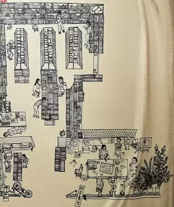 还有一幅明目书社俯瞰插画,我和赖老板就是在门口桌子旁喝茶聊天