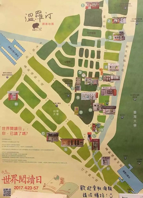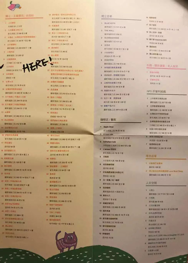 第三份叫读爱温罗汀,由台湾独立书店协会印行,在公共册所二手书店发现了它,店员说书店里已经没有这份地图。细看这份地图,基本上收录了很全面的温罗汀书店分布,和2012年那个温罗汀读书地图比较,已有了很大变化,有些书店没有了,又新开了很多书店。