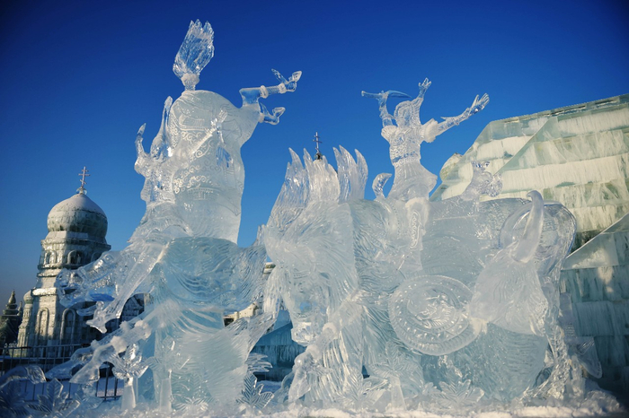 1月4日,为期5天的第七届中国哈尔滨国际组合冰冰雕比赛在哈尔滨冰雪大世界园区落下帷幕。这是获得二等奖的作品、俄罗斯雅库特代表队创作的《爱的传奇》。