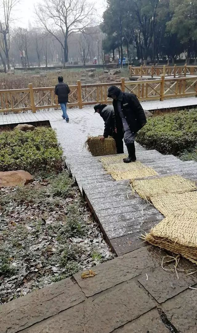 沙湖公园在坡道和桥梁处铺上草垫防滑,并撒上工业用盐,防止积雪结冰。中山公园、解放公园、青山公园、南干渠游园、关山公园等公园也铺上了防滑草垫,防止市民游客跌倒受伤。