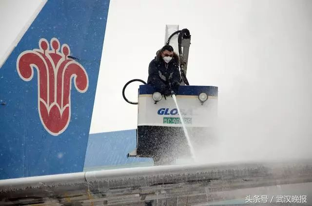 南航湖北分公司启动冰雪天气运行保障预案,20人的除冰小队对飞机翅膀进行除冰工作。