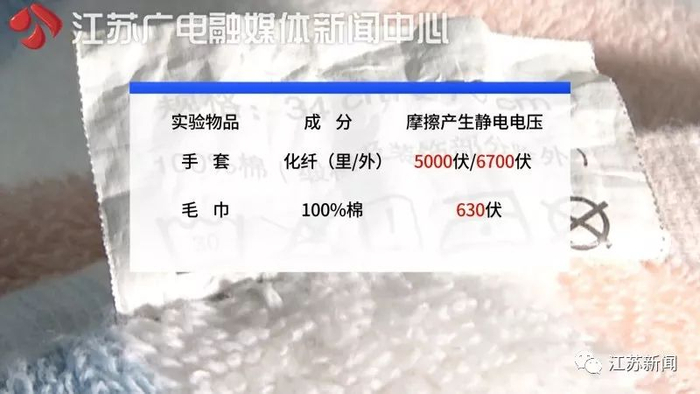 为确保实验的精确性,在进行下个实验前,专家特意用手擦拭了一遍尺子,"导走"其携带的电荷。接下来,记者又分别测试了羽绒服和手套产生的静电电压。其中,羽绒服里层和毛领分别与尺子多次摩擦后,静电电位计显示电压为2400伏和6500伏;而手套外层的静电电压为5000伏,里层为6700伏!随后,记者又用一条纯棉的毛巾和尺子多次摩擦,结果用静电电位计测出电压仅为630伏。