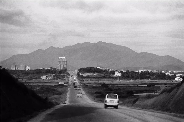 深南路(1983年),何煌友摄。朝东方向的深南路,途中路边唯一的一座大楼为电子大厦,背景为梧桐山。