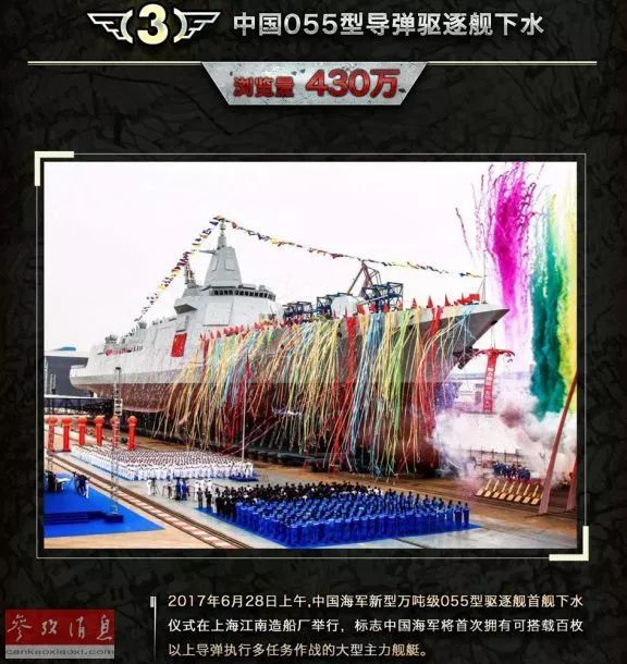 【中国055型导弹驱逐舰】2017年6月28日上午,中国海军新型万吨级055型驱逐舰首舰下水仪式在上海江南造船厂举行,标志中国海军将首次拥有可搭载百枚以上导弹执行多任务作战的大型主力舰艇。