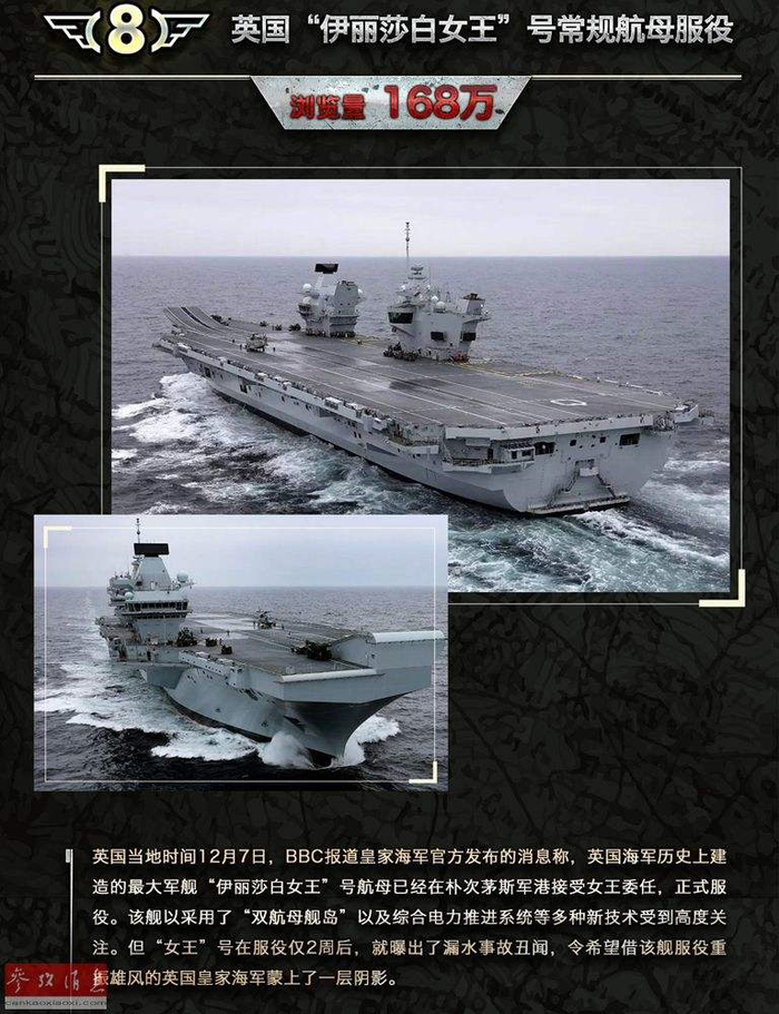 【英国“伊丽莎白女王”号航母】英国当地时间12月7日,BBC援引皇家海军官方发布的消息称,英国海军历史上建造的最大军舰“伊丽莎白女王”号航母已经在朴次茅斯军港接受女王委任,正式服役。该舰以采用了“双航母舰岛”以及综合电力推进系统等多种新技术受到高度关注。但“女王”号在服役仅2周后,就曝出了漏水事故丑闻,令希望借该舰服役重振雄风的英国皇家海军蒙上了一层阴影。