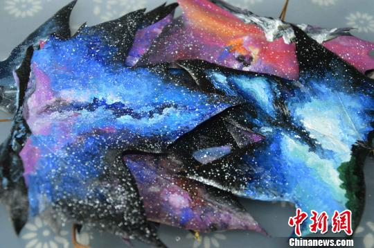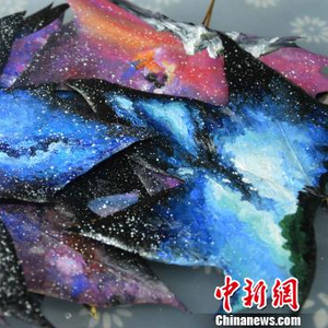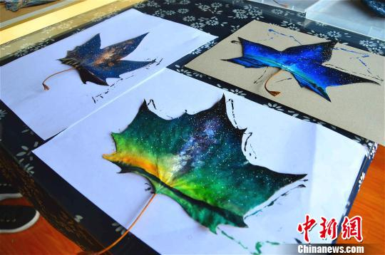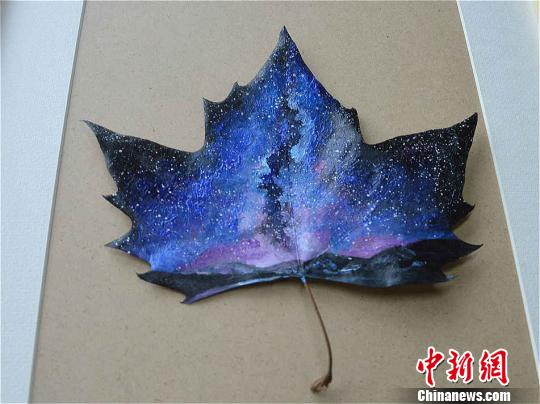 “它们刚刚画完不久,正等着上面的染料变干。”孟瑜婷一边说,一边小心翼翼地将自己之前创作的作品拿了出来。她说,自己之所以在树叶上创作的第一幅作品就是《星空》,就是因为看到其相关的摄影作品,想以不同的形式呈现出《星空》之美。