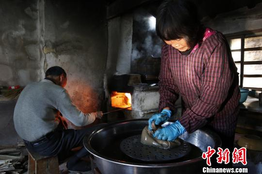 图为林国祥夫妻俩一个烧火、一个榨汁。 姚峰 摄