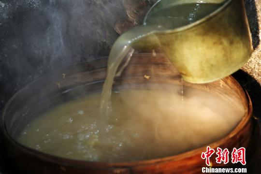 图为一大锅薯汁随着水气蒸发。 姚峰 摄